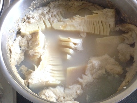 皮をむいて大きく切って米ぬかと一緒に茹でてしまいます。