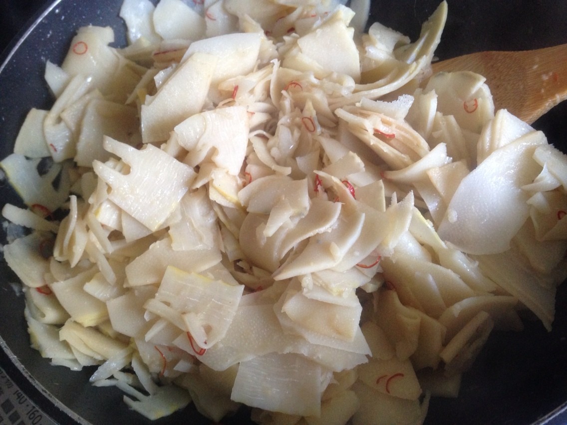 ①ニンニクのすりおろしをたっぷりのサラダ油で炒め、極薄く切ったタケノコを加えて炒める。