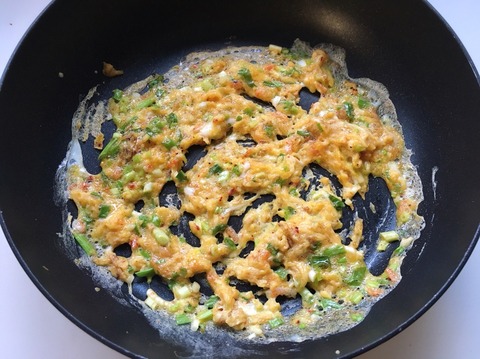 卵2個に砂糖小さじ2、塩ひとつまみ。桜エビを手で砕いて、小口切りの細ネギ
