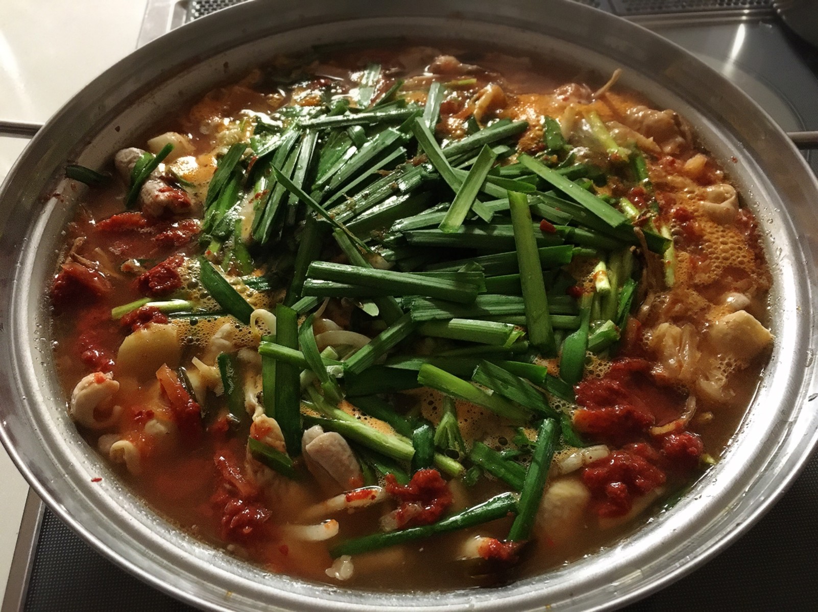 みそ味のもつ鍋に水煮のカットトマトを加えたものですが、