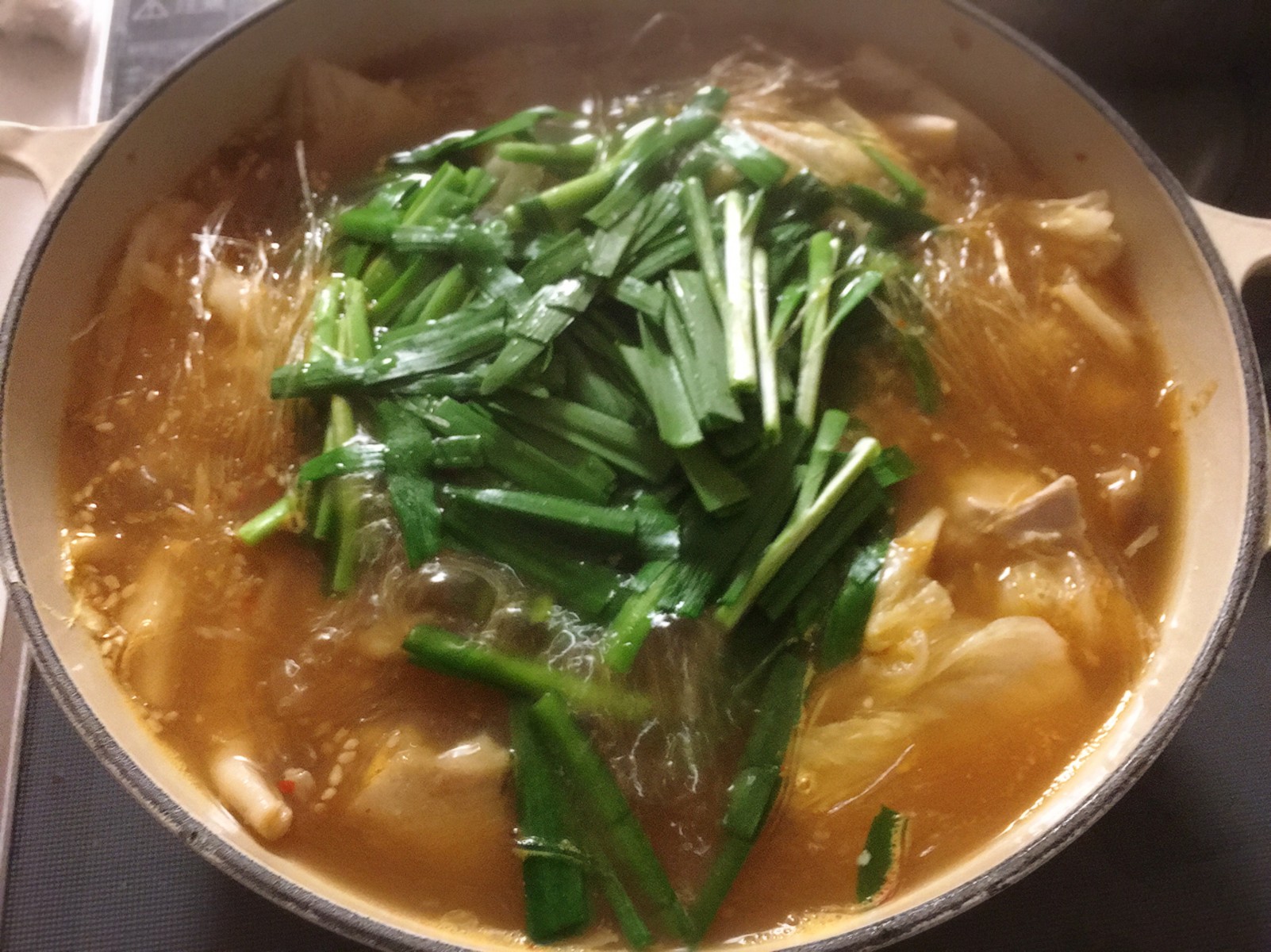 ピリ辛の中華スープに、鶏ももとハクサイ、春雨、ニラを