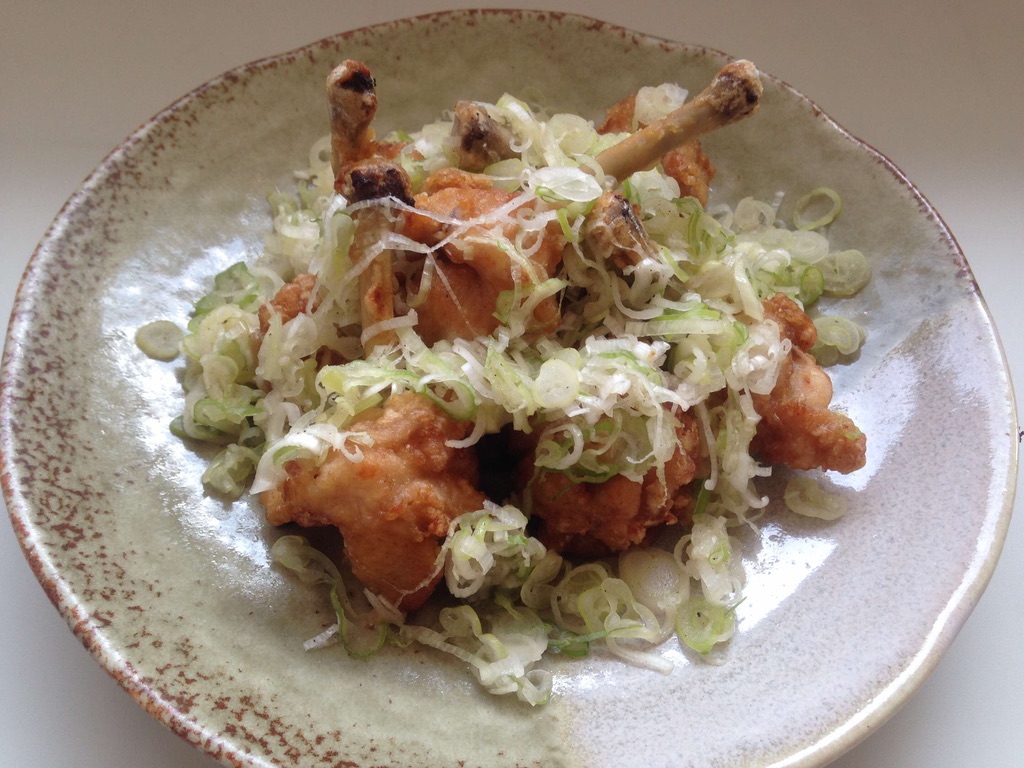 鶏のから揚げにネギ塩ダレをからめた一皿です。大量のネギが調味料になりま …