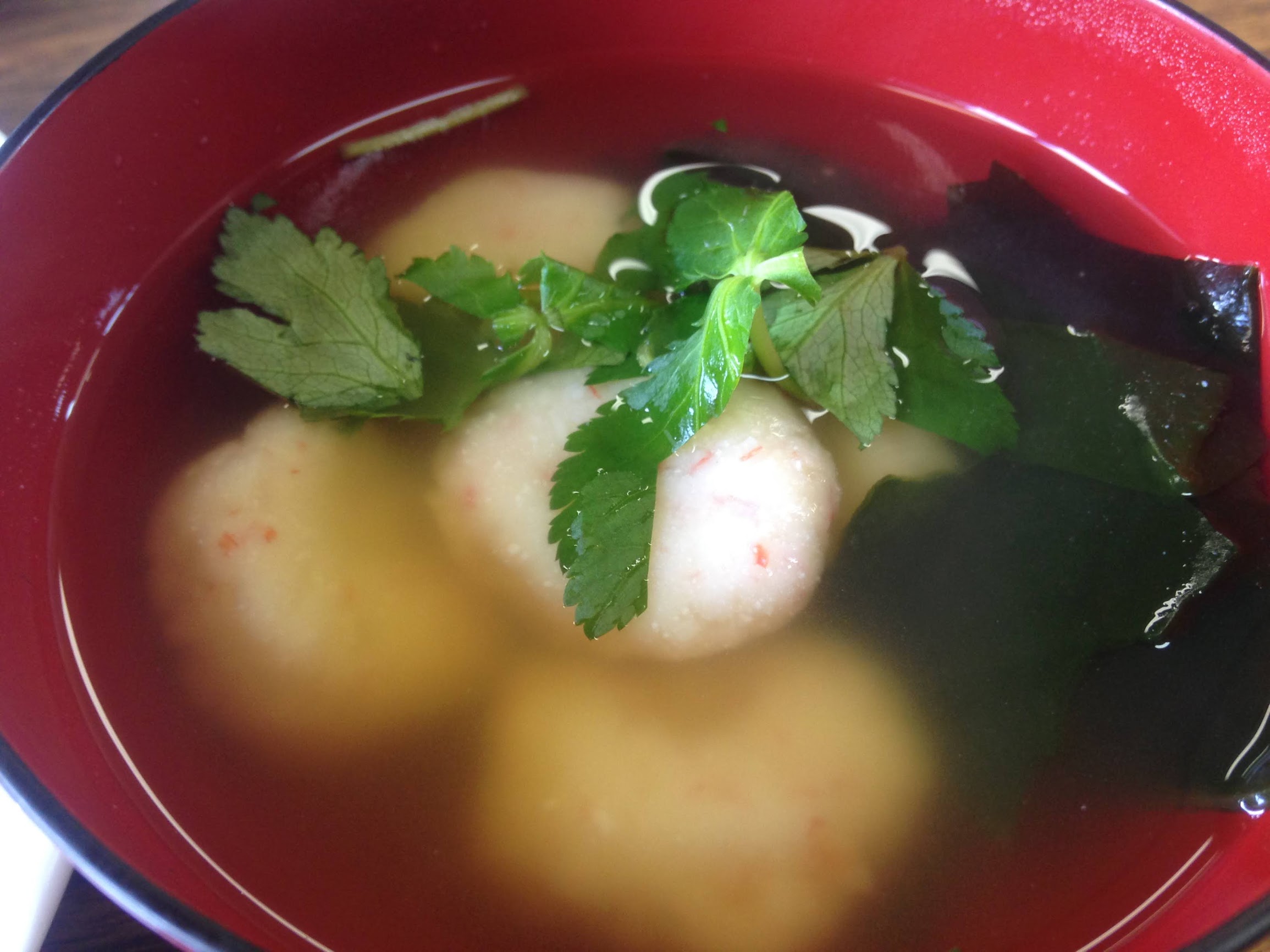 豆腐でねった白玉団子を入れたお吸い物です。もちもちのお団子にカニカマの …