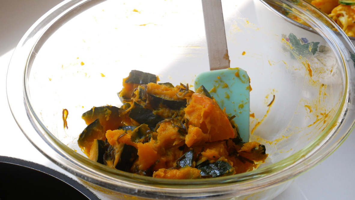 蒸したカボチャに塩昆布とバターを混ぜ合わせた1品です。冷めても美味しい …