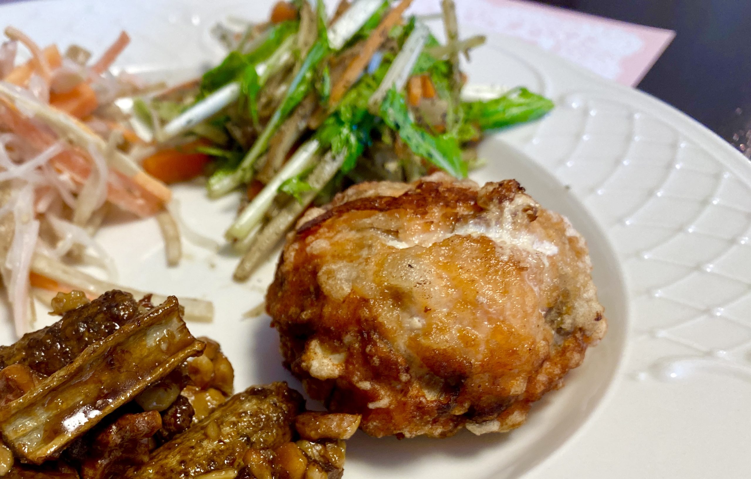 細切りんのじゃがいもに甘酢だれをからめた一品です。あともう一品というと …