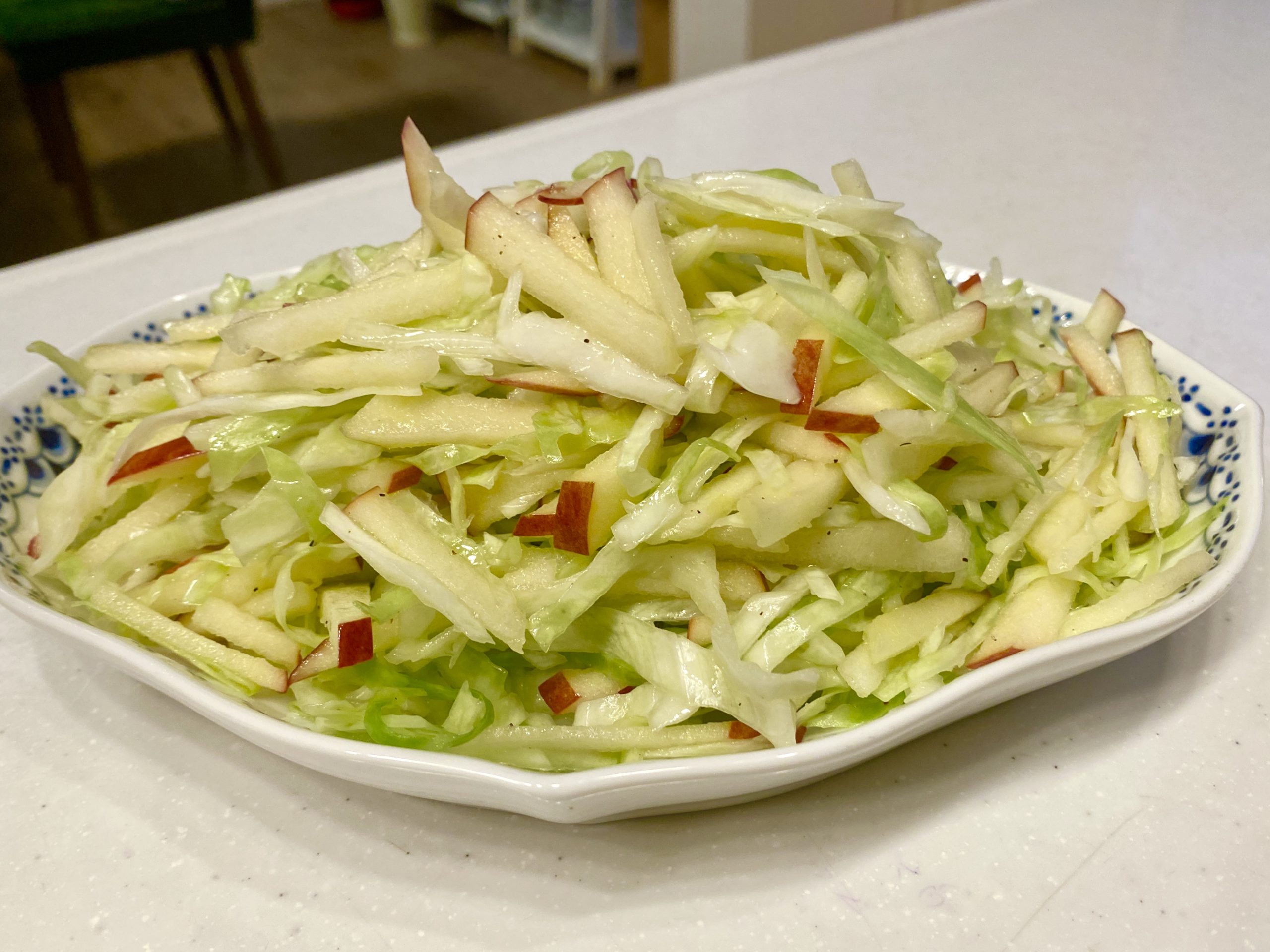細く切ったりんごとキャベツを和えたサラダです。保存が効くので常備菜にも …