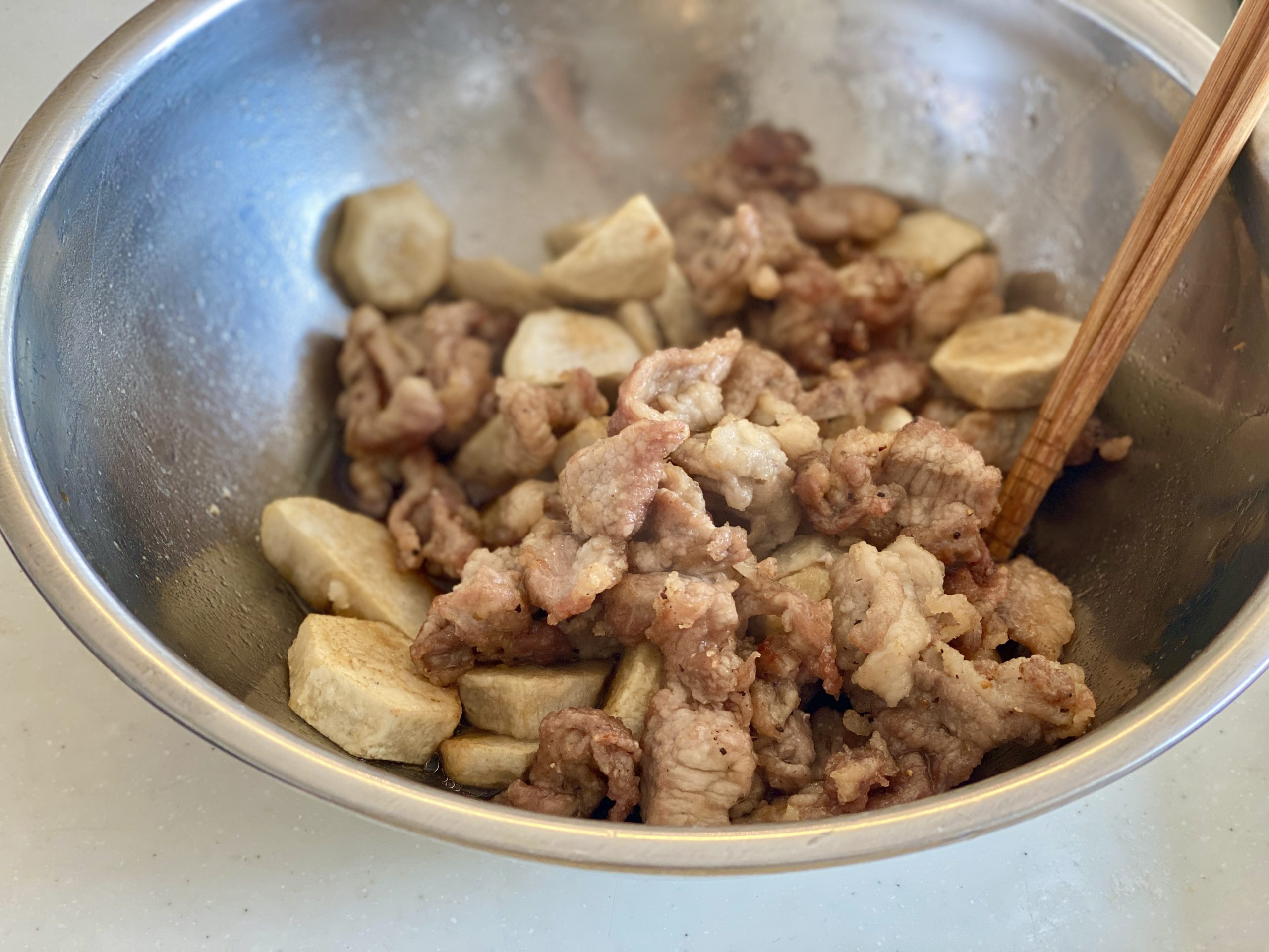 唐揚げにしたサトイモと豚肉にあまからだれを絡めた1品です。冷めても美味 …