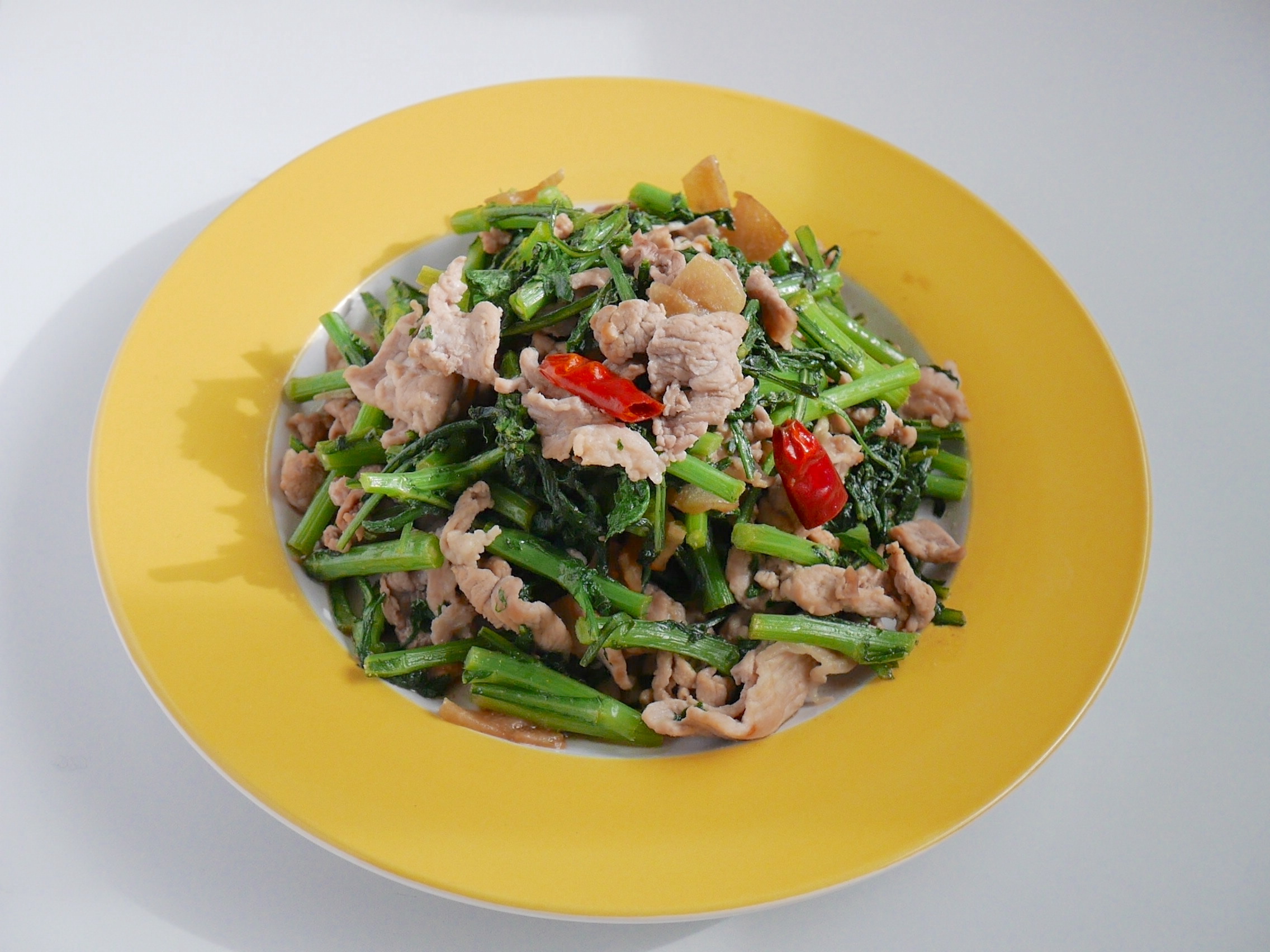 春菊と豚肉を組み合わせた炒めものです。定番の調味料だけでエスニック風に …