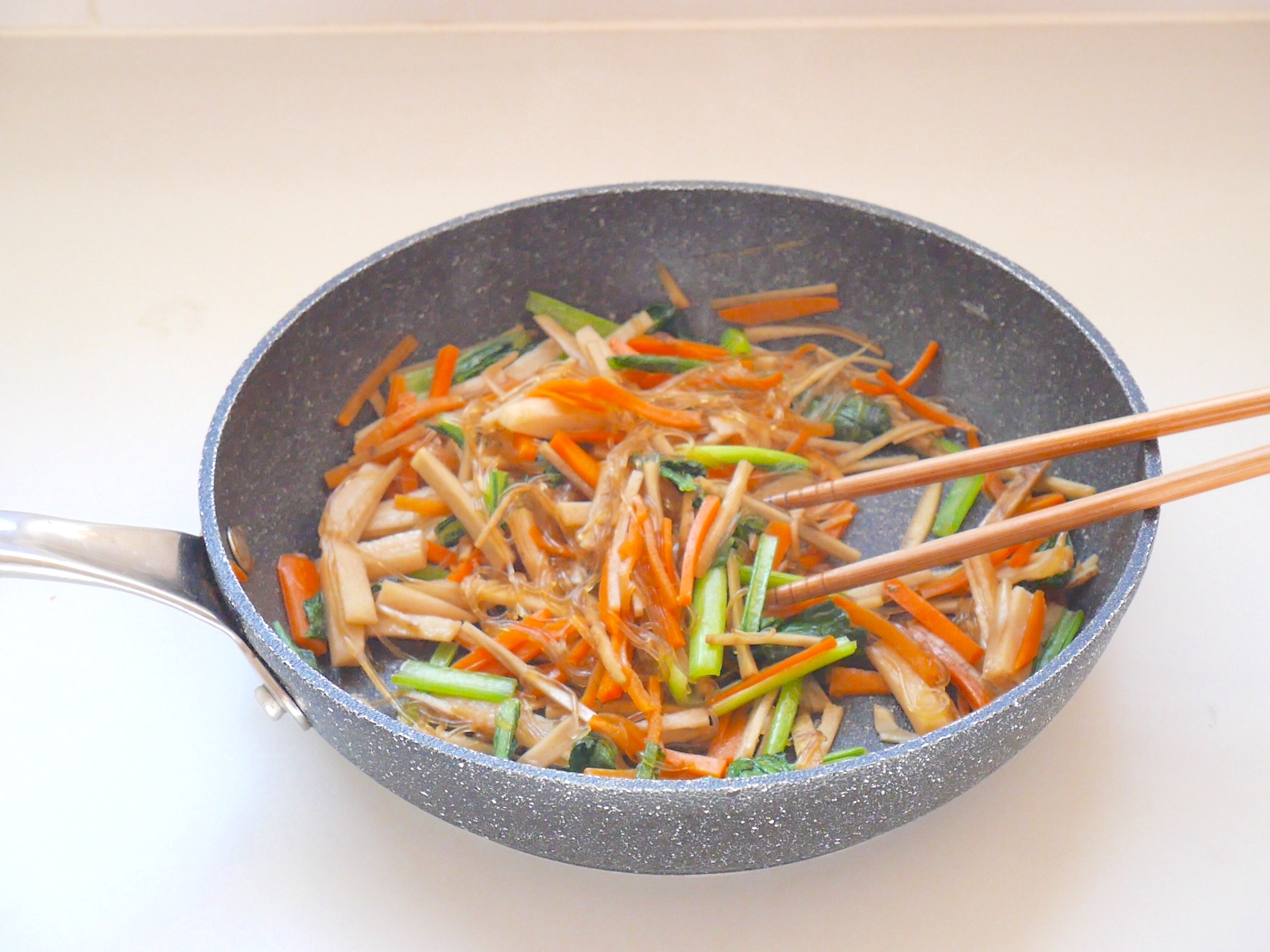 いつものきんぴらに、コマツナと春雨を加えた一品です。春雨が加わることで …