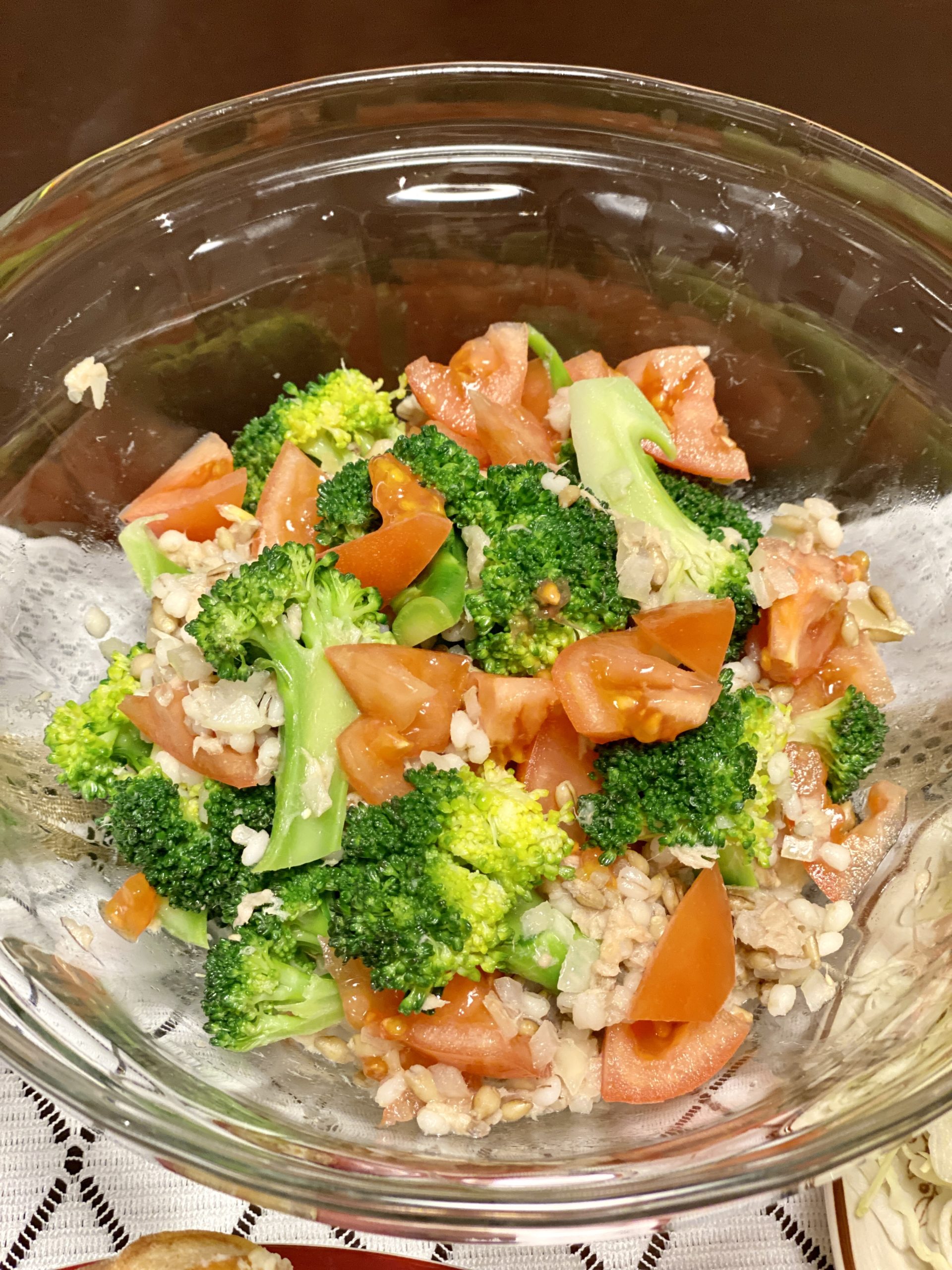 茹でたブロッコリーにもち麦などを加えたサラダです。食物繊維がたっぷり取 …