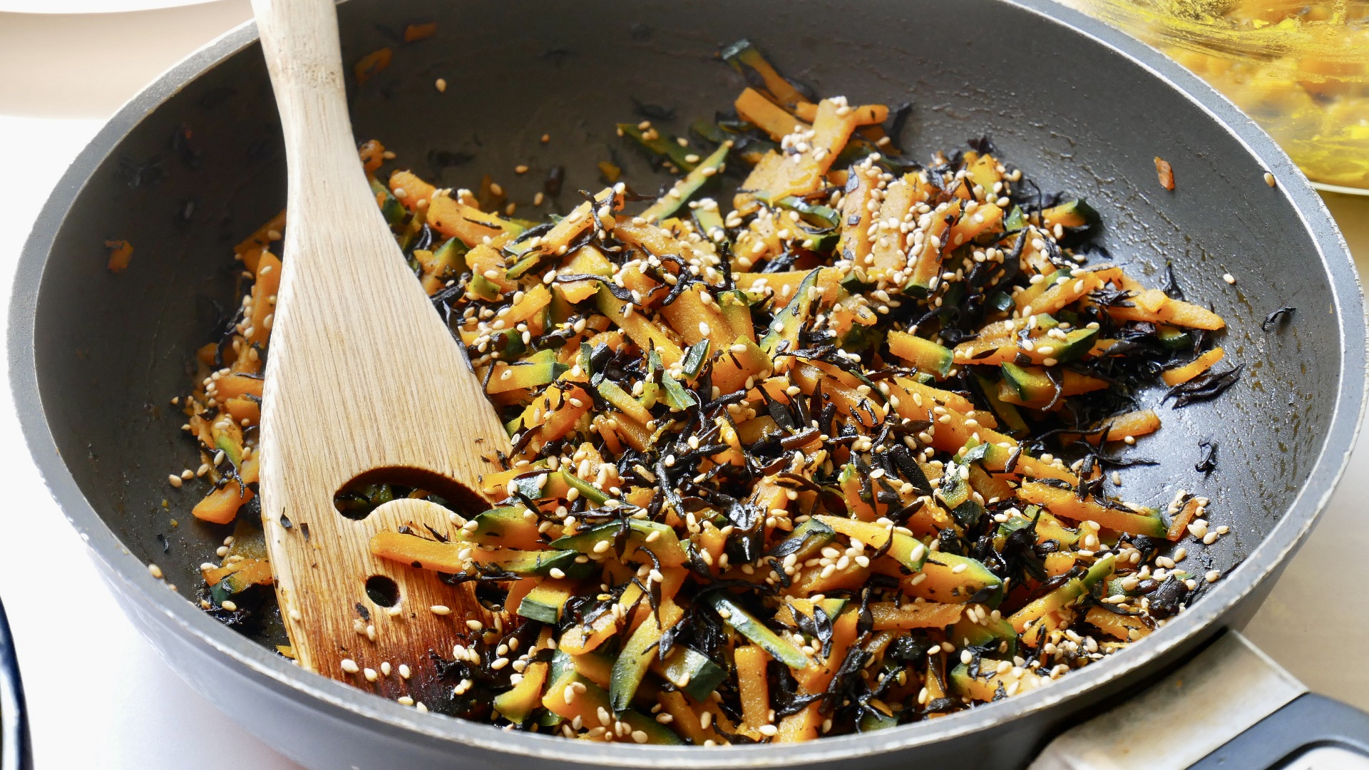 ニンジンはできるだけ薄く切ってください。保存が効くので作り置き料理としてもおすすめです。