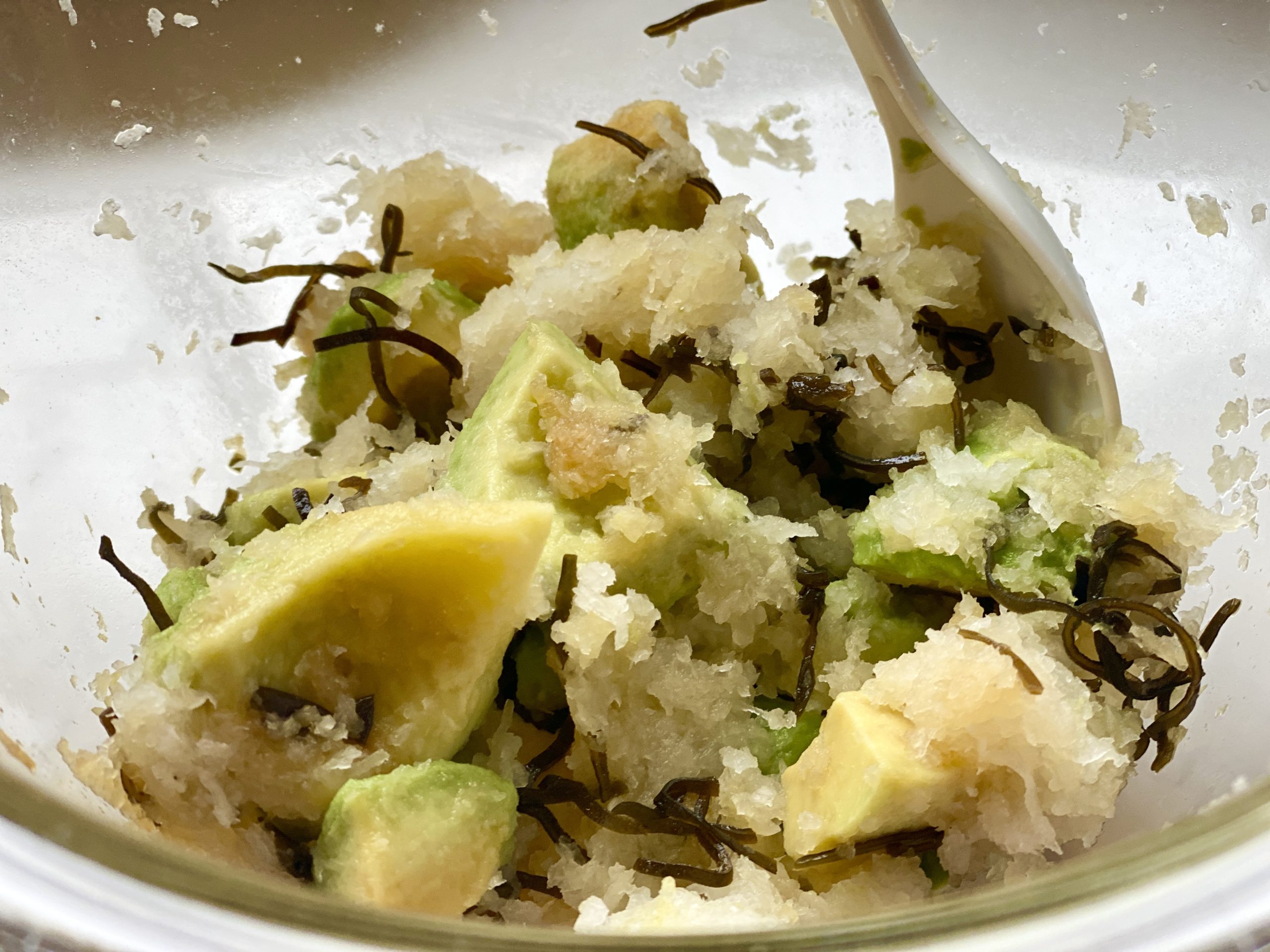 ②長芋の皮をむいてすりおろし、白だしと水を加えます。よく混ぜてキャベツの上にかけます。
