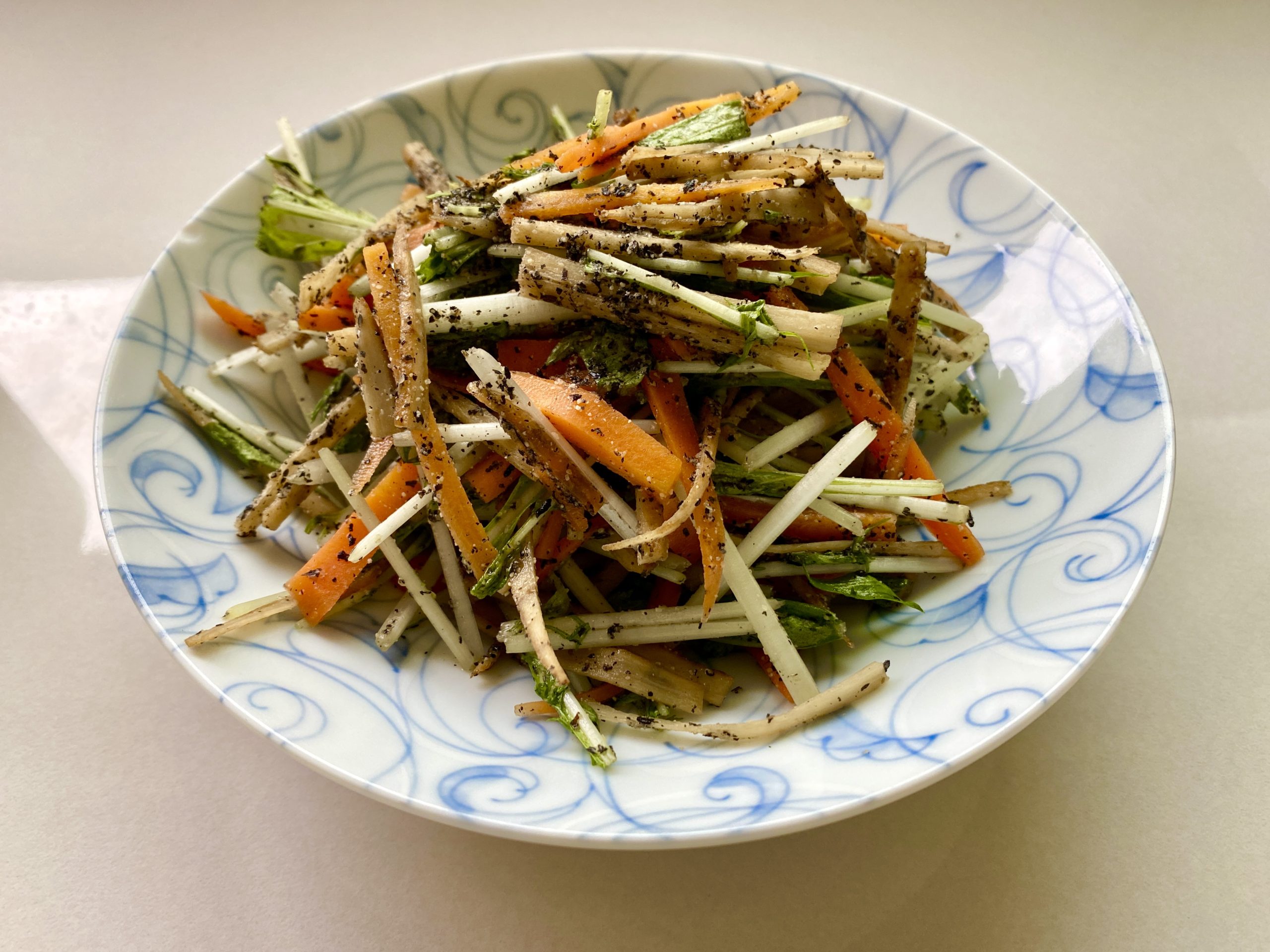 細切りのごぼうと水菜をごま風味に味付けしたサラダです。シャキシャキ食感 …